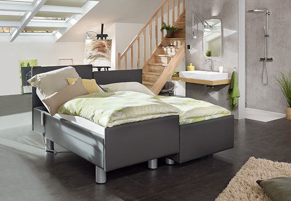 - Các bánh xe được che phủ bởi trụ nhôm giúp tạo sự chắc chắn và sang trọng cho giường. Trụ có thể nâng lên hoặc hạ sát mặt sàn nhờ 1 phím bấm điều khiển, giúp giường vững chắc khi không di chuyển.