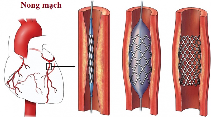 - Nong mạch: dùng một ống thông để nong động mạch, đặt stent mạch máu bị hẹp nặng hoặc tắc nghẽn.